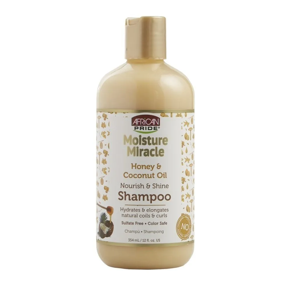 African Pride Moisture Miracle Honey & Coconut Oil Nourish & Shine Shampoo, deze sulfaat-vrije reiniger is verrijkt met honing en kokosolie voor een perfecte reiniging, voeding en hydratatie zonder het haar te strippen van zijn natuurlijke oliën waardoor het haar droog zou gaan aanvoelen.